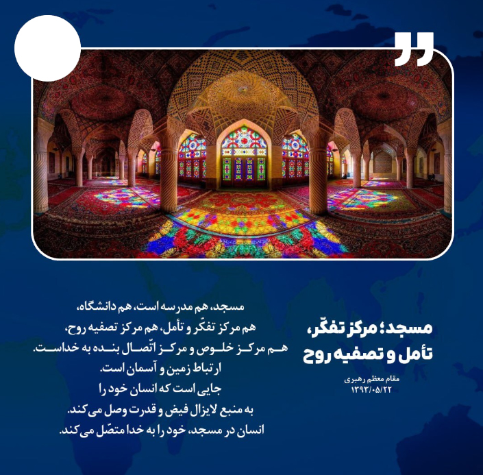 به بیانات حضرت آقا هم که مراجعه میکنیم میخوانیم: " مسجد اهمّیّت دارد، پایگاه است؛ همچنانکه معروف شده در زبانها واقعاً پایگاه است. نهفقط پایگاه برای فلان مسئلهی اجتماعی، [بلکه] مسجد میتواند پایگاه همهی کارهای نیک باشد؛ پایگاه خودسازی، انسانسازی، تعمیر دل و تعمیر دنیا و مقابلهی با دشمن و زمینهسازی برای ایجاد تمدّن اسلامی و بصیرتافزاییِ افراد؛ و هَلُمَّ جَرّا. مسجد یک چنین جایگاهی است. "